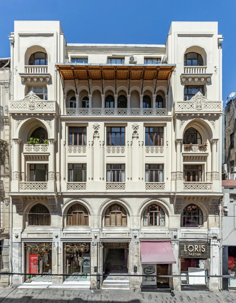 Muradiye Han, completed in 1914, has held an important place in the commercial life of Karaköy. During the occupation of Istanbul, it was used by French military forces and came to be known as Muradiye Station. In the building, which underwent restoration in 2021, an installation is displayed on the ground floor as part of the biennial.