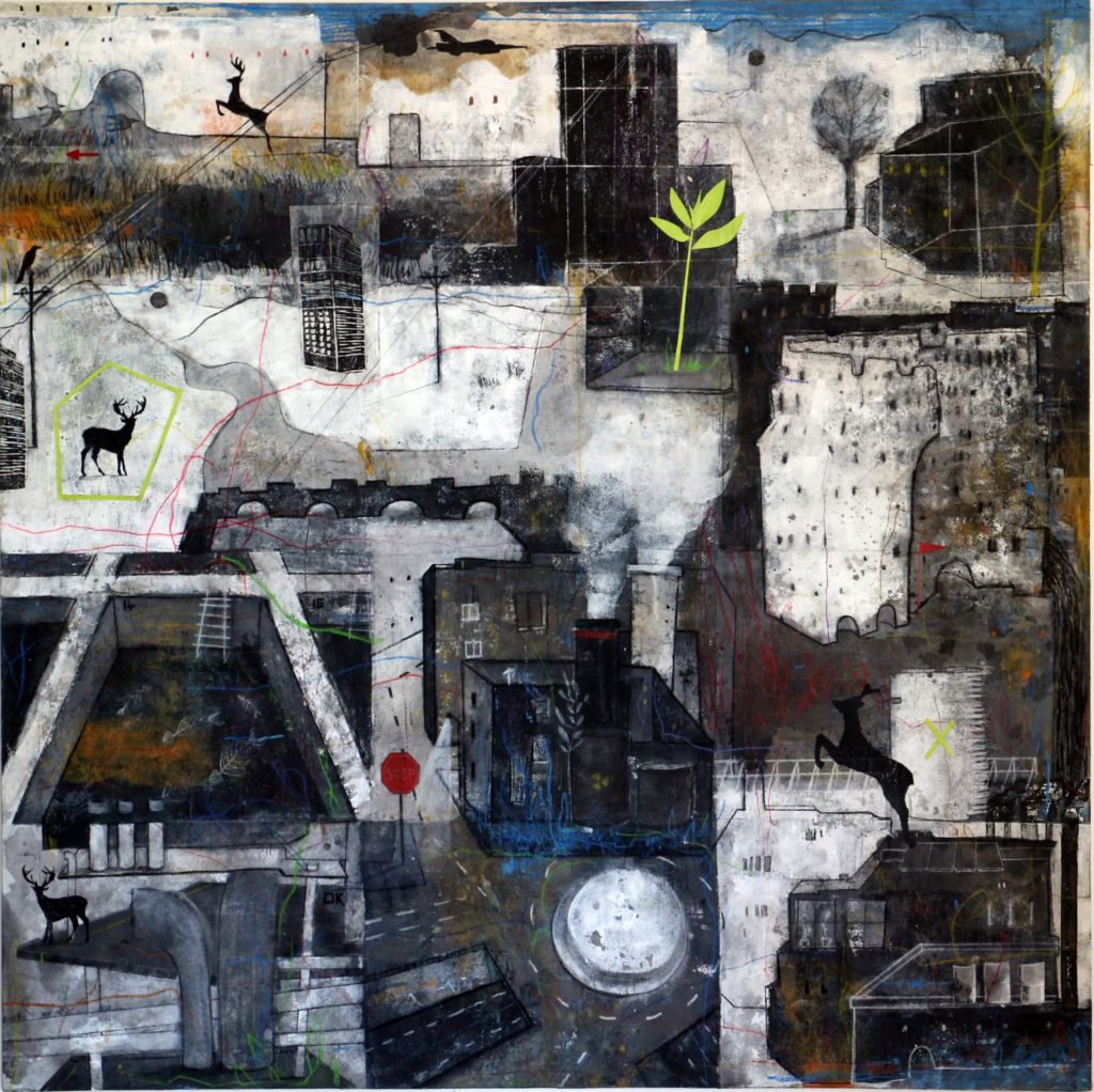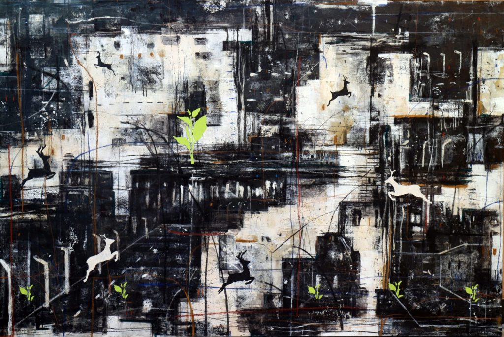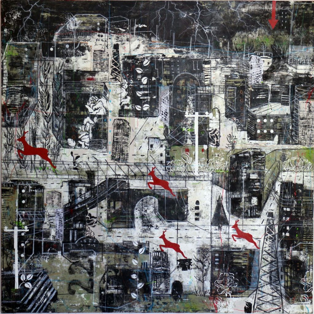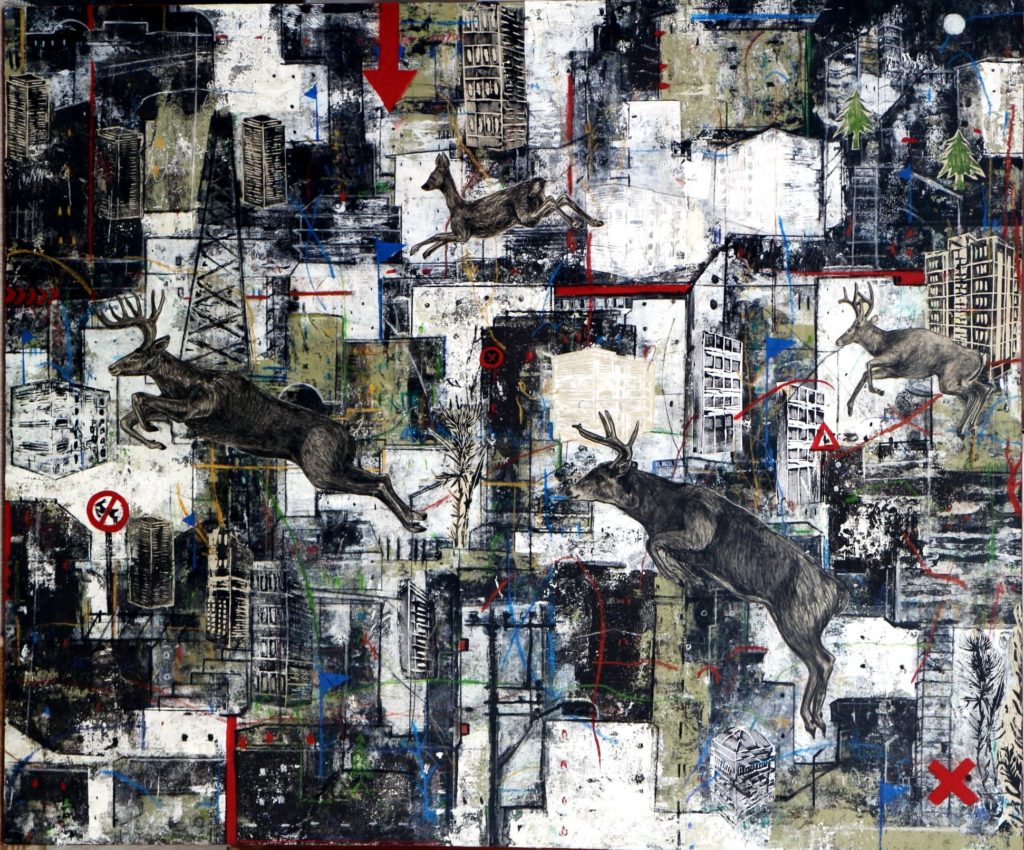 Mixed media on canvas.