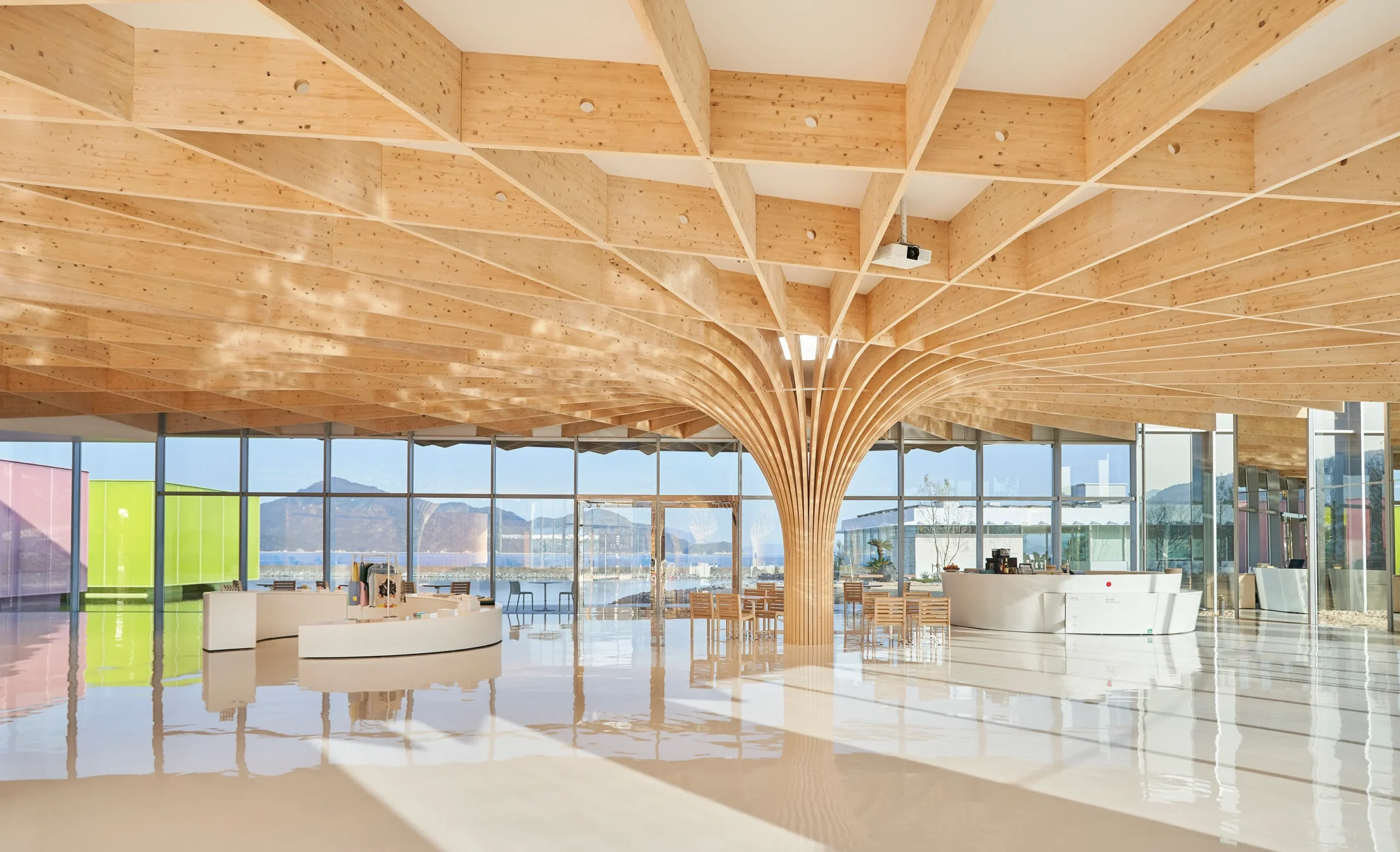 Simose’i ilk bakışta farklı kılan şey, 190 metre uzunluğundaki aynalı koridoru. Bu yapı, çevredeki denizi ve gökyüzünü yansıtarak mimariyi görünmez hale getiriyor ve doğayla görsel bir bütünlük kuruyor. Ön cepheden bakıldığında müze neredeyse siliniyor, deniz manzarasıyla bilinçli bir şekilde bütünleşiyor.