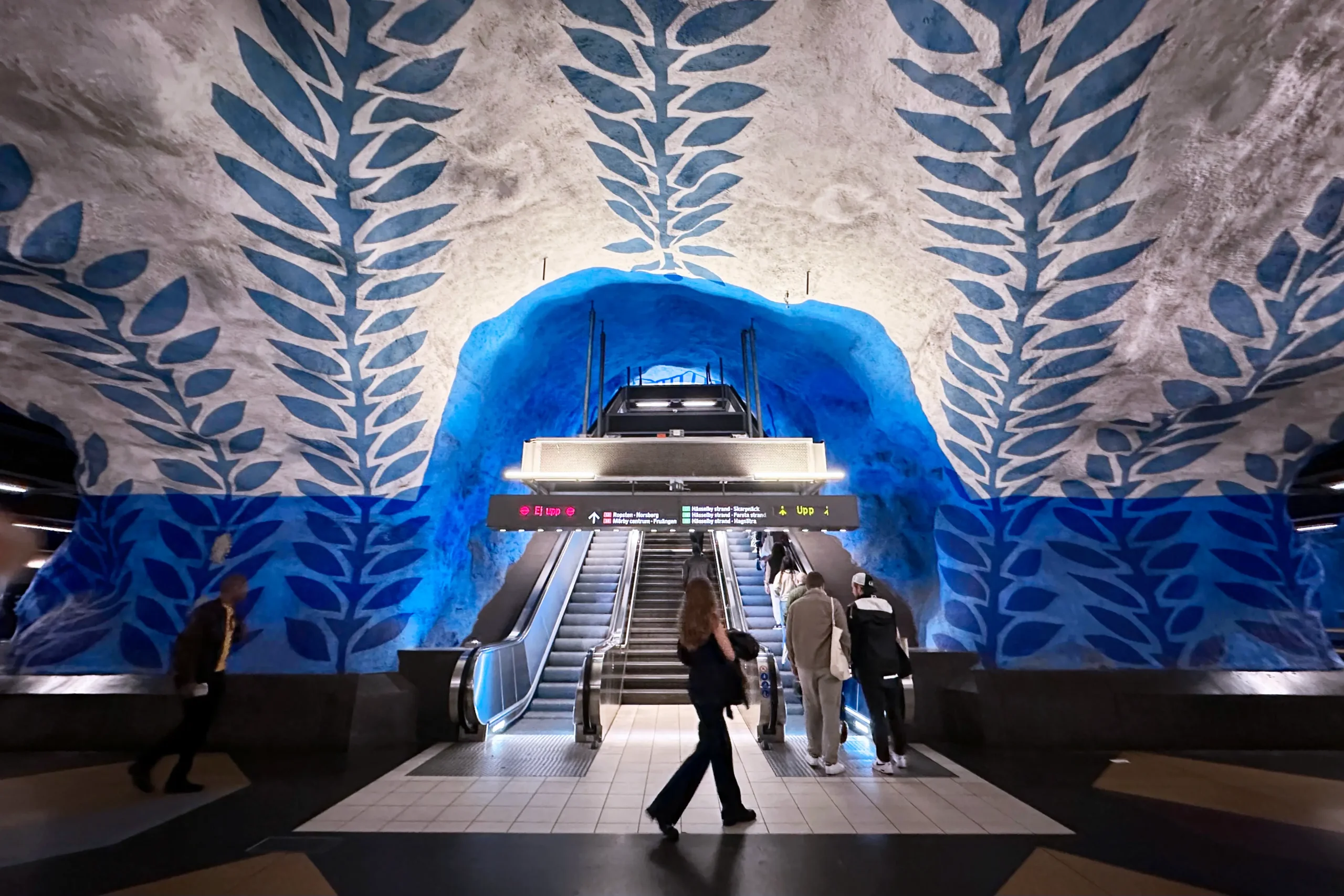 Stockholm metrosunun kalbi. T-Centralen her şeyin başladığı yer—ilk sanat eserinin bir metro istasyonunda yer aldığı nokta. Ama beni en çok etkileyen kısım, 1975’te açılan Mavi Hat platformu oldu. Duvardan tavana uzanan zarif sarmaşık motifleri, mavi tonların huzur veren etkisiyle birleşince, şehrin koşturmacasında kısa bir duraklama noktası yaratıyor.