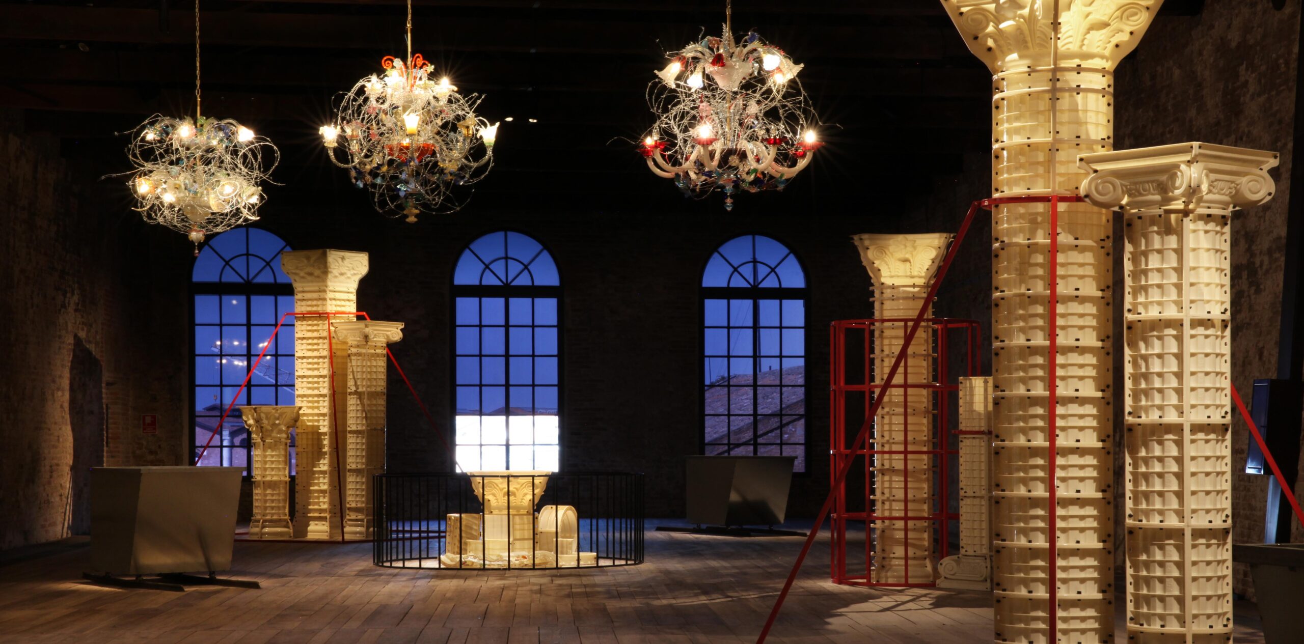 Pavyonda ayrıca farklı yüksekliklerde içi boş, plastik sütun kalıpları yer alıyor. Ancak destekler yardımıyla ayakta durabilen bu kalıplar, geleneksel olarak zafer ve dayanıklılığı çağrıştıran sütunlarla tezat oluşturarak serginin ele aldığı boşluk ve kırıklık duygularını somutlaştırıyor. Mekânda ayrıca, atık Murano camı parçalarıyla yüklü vagonlar bulunuyor.
